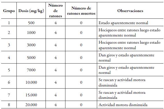 Teniendo como referencia a Loomis y otros autores [32,33] para la determinación de la toxicidad aguda por vía oral en ratones albinos sometidos a dosis crecientes de extracto seco de diclorometano de Tropaeolum tuberosum R & P mashua, según el criterio de Williams se comprobó que el extracto es prácticamente atóxico hasta la dosis de 16.000 mg/kg de peso, de lo cual se deduce que la dosis letal media está por encima de esta medida, dosis que por ser muy elevada no se llega a administrar a una persona con peso promedio de 70 kg. [10,20]