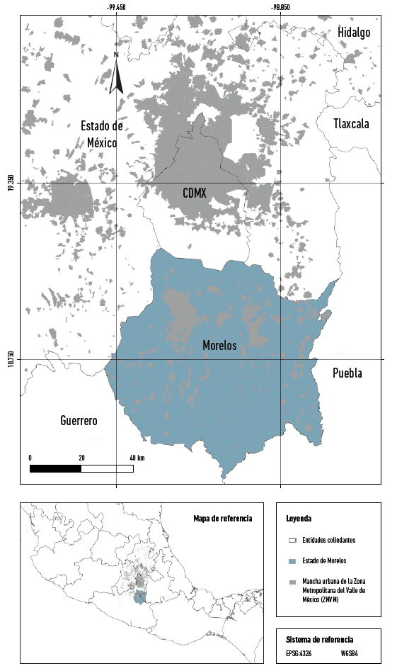 El estado de Morelos forma parte de las 32 entidades federativas de los Estados Unidos Mexicanos. Localizado en la zona centro del país (longitud 99°29’39,84” W a 98°37’58,44” W, latitud 18°19’56.64” N a 19°7’54,12” N), con una superficie de 4.950 km2, colinda con las siguientes entidades federativas: Estado de México, Tlaxcala, Puebla y Guerrero. Así mismo, su ubicación al sur de la Ciudad de México (CDMX) lo enmarca en la geopolítica de la gran mancha urbana que constituye la zona metropolitana del valle de México (ZMVM) (Figura 1).