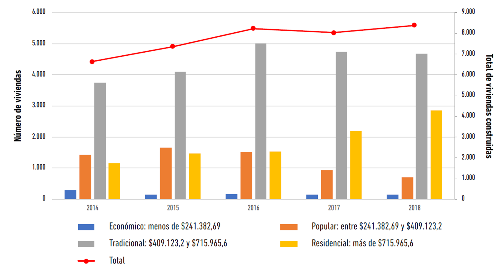 La investigación permite reconocer que, en el estado de Morelos, diversos grupos de capital de las ramas inmobiliarias y de la construcción han impulsado un proceso de construcción del espacio urbano por encima de la propia medida del mercado. Entre 2015 y 2018 se produjo un incremento en la construcción de viviendas de tipo tradicional, seguida de aquellas de tipo residencial. Los datos encontrados acerca del número de viviendas construidas en el estado de Morelos muestran que existe la tendencia creciente a aumentar la extensión de la mancha urbana en el estado de Morelos y, además, a orientar dicha construcción de viviendas de mediano y alto costo en el sentido contrario que históricamente ha seguido el salario de la población morelense (Figura 3).
