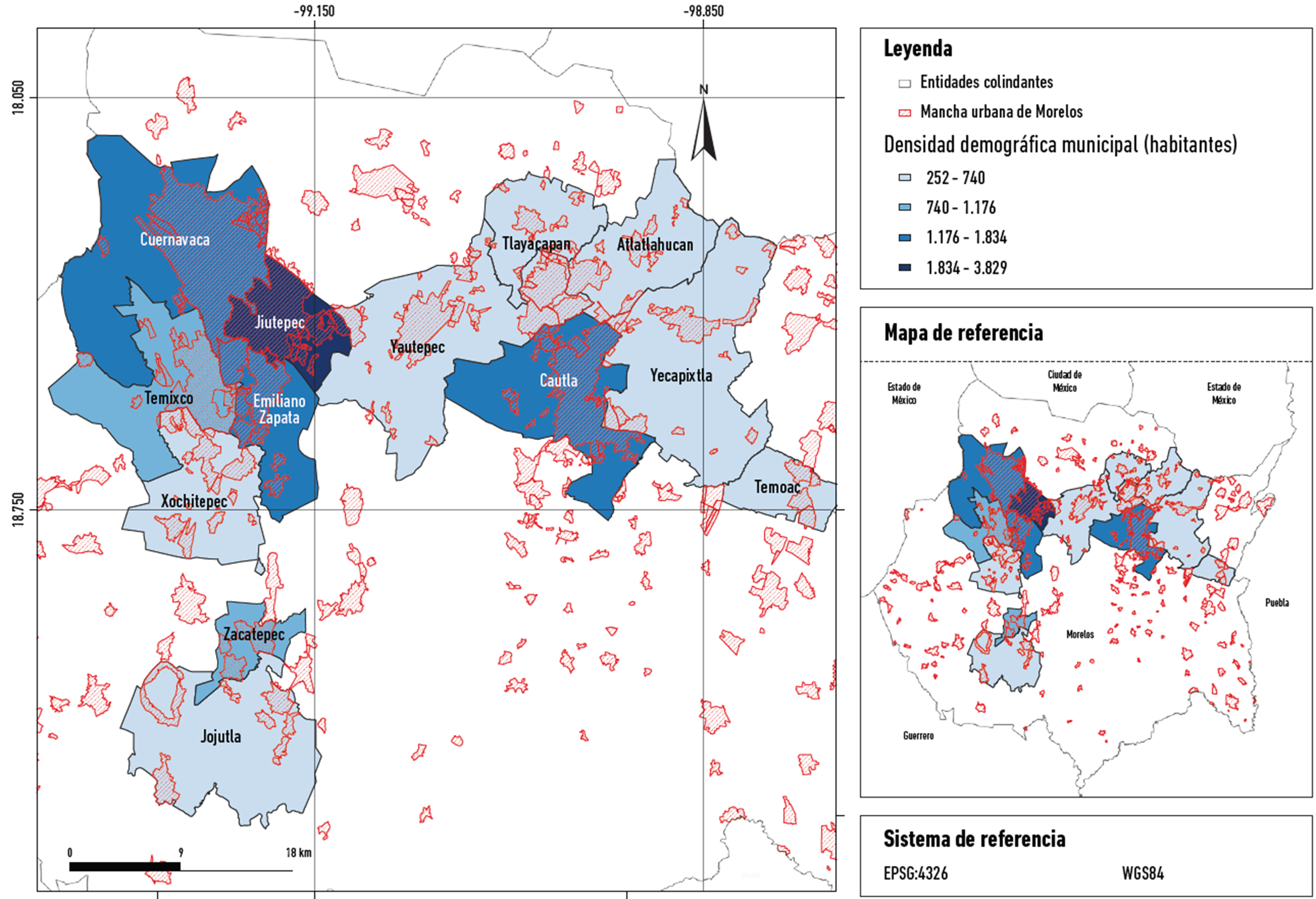 Figura 4: Áreas urbanas construidas y la densidad demográfica del estado de Morelos.