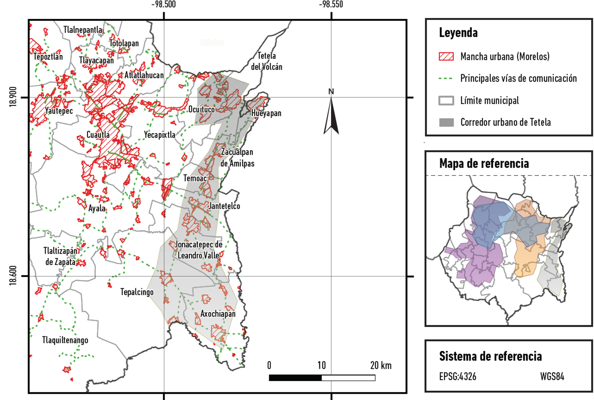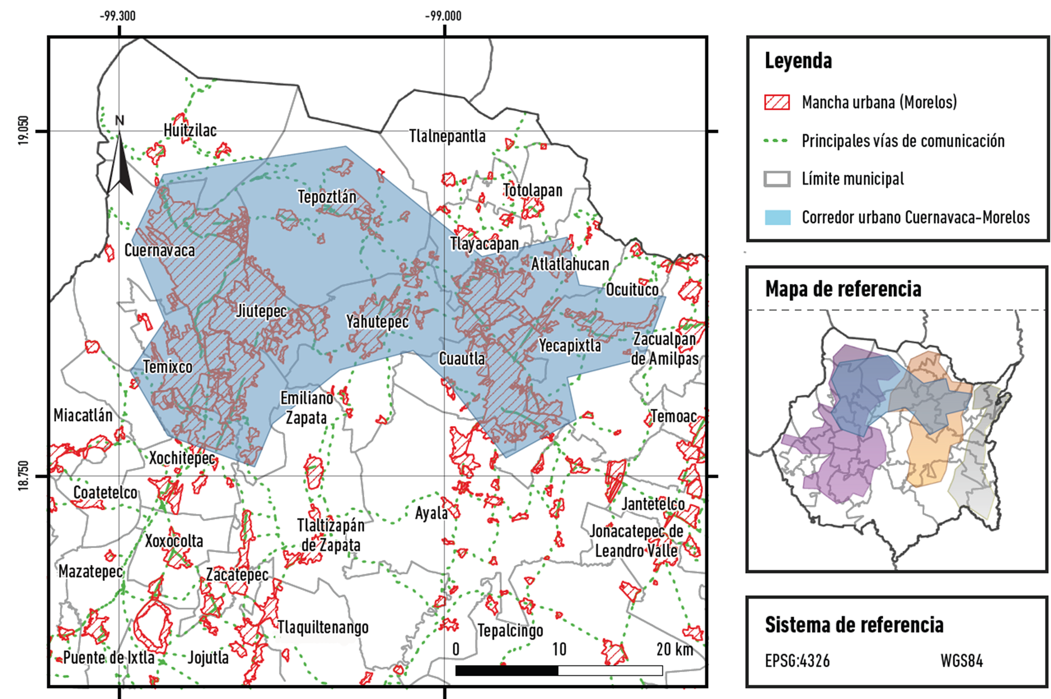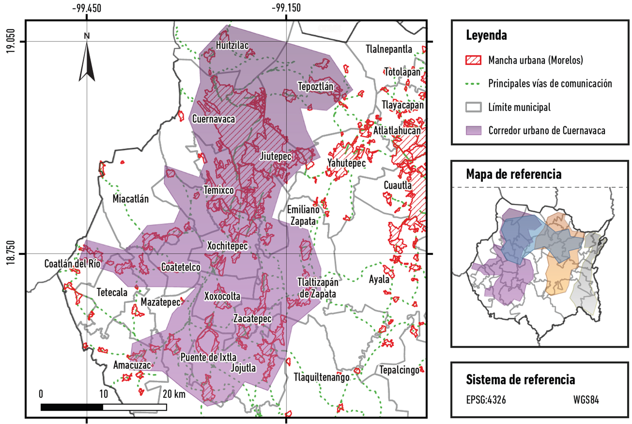 Tal producción espacial ha derivado en la configuración de cuatro corredores que atraviesan vertical y horizontalmente la entidad. El primero de estos es el que se ubica en el poniente del estado de Morelos y se ha denominado Corredor Urbano Cuernavaca, integrado por las áreas urbanas construidas en los límites territoriales de los municipios de Huitzilac, Tepoztlán, Cuernavaca, Jiutepec, Temixco, Emiliano Zapata, Xochitepec, Coatetelco, Xoxocotla, Tlaltizapán, Puente de Ixtla, Amacuzac y Jojutla (Figura 5).