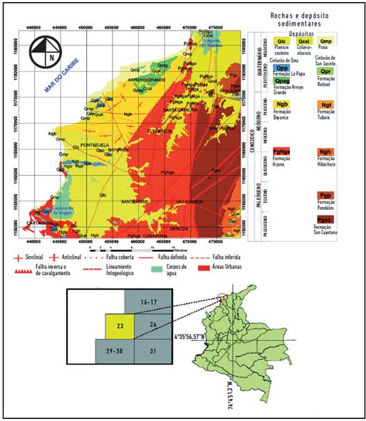 A área de estudo está compreendida pela porção emersa da carta topográfica Cartagena 1:100.000, produzida pelo Instituto Geográfico Augustín Codazzi (IGAC), a qual possui, também, sua correspondente geológica elaborada pelo Instituto Colombiano de Geología y Minería (Ingeominas) (figura 1).