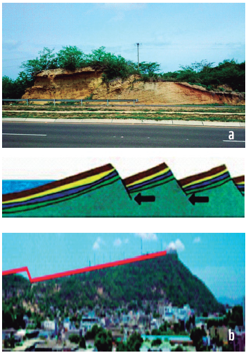Figura 3: a) Falha de cavalgamento com dobramento na Formação Bayunca (Sistema de Coordenadas: UTM Z 18N 450564W 1163397N - Altitude na base: 25 m); b) Figura que demonstra uma sequência de falhas de empurrão e rejeito de uma falha no Cerro de La Popa, formando dois níveis topográficos.