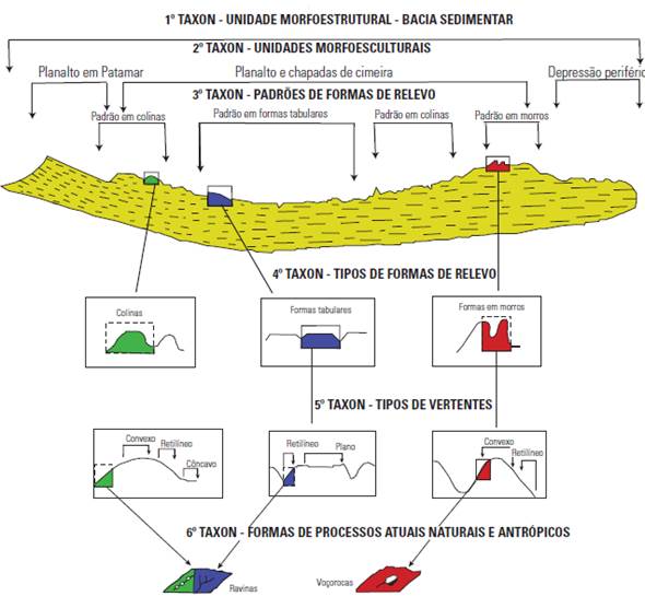 O 1° Táxon corresponde à definição de morfoestrutura, e o 2° Táxon representa as morfoesculturas desenvolvidas sobre a morfoestrutura. O 3° Táxon corresponde às unidades dos padrões de formas semelhantes de relevo. Essas unidades menores apresentam diferenças entre si, como a rugosidade topográfica ou o índice de dissecação do relevo. Os padrões de relevo podem ser formas de acumulação, como planícies fluviais, marinhas ou intermarés (manguezais), ou denudacionais, como colinas, morros e tabuleiros.