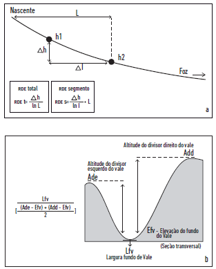 Na fórmula apresentada para a obtenção do índice RDEtotal (RDEt), ∆h é a diferença altimétrica entre dois pontos extremos de um segmento ao longo de um curso de água (nascente e a foz). Ln corresponde ao logaritmo natural do canal e L é a distância entre a nascente e a desembocadura. De forma similar, para o índice RDEsegmento (RDEs), ∆h é a diferença altimétrica entre dois pontos do canal em que o índice está sendo calculado; ∆l corresponde à projeção horizontal do segmento em evidencia e L é o comprimento total do curso de água acima do ponto para o qual o índice está sendo calculado (figura 5a).