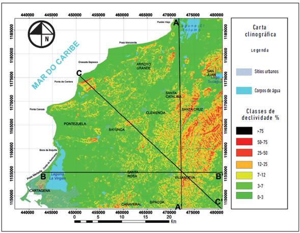 Figura 6: Carta clinográfica da área de estudo com a localização dos perfis topográficos traçados.