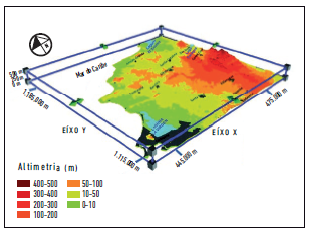 O modelo numérico do terreno (doravante MNT) gerado (figura 7) proporciona a visualização de elevações pronunciadas, que alcançam cotas altimétricas desproporcionais à média da elevação da área no setor leste, e uma morfologia com altimetrias muito mais baixas em direção à linha de costa.