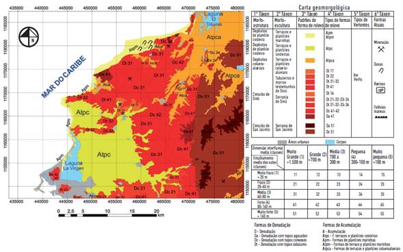 Baseado na construção e análise da carta geomorfológica produzida (figura 9), foram individualizadas cinco morfoestruturas para a área: Cinturão de San Jacinto, Cinturão de Sinú, depósitos de planície costeira, depósitos coluvioaluviais e depósitos de praia. As morfoestruturas foram subdivididas em seis morfoesculturas assim denominadas: Serrania de San Jacinto, Serrania de Sinú, Baixos Tabuleiros e Morros Testemunhos de Sinú, Terraços e Planícies Costeira, Terraços Coluvioaluviais e Terraços e Planícies Marinhas.