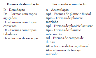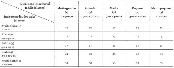 Os padrões de forma de relevo estão acompanhados de um conjunto de algarismos arábicos de acordo com uma matriz previamente elaborada, cujas colunas indicam o grau de incisão dos vales; as linhas, a dimensão interfluvial média (tabela 3). As formas agradacionais não recebem os algarismos arábicos, pois não representam dissecação por processos erosivos.