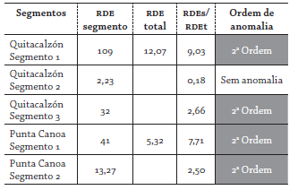 No riacho Punta Canoa, nos dois segmentos analisados, foram encontradas anomalias de segunda ordem. No segmento 1, que percorre a Formação Bayunca, o valor obtido foi superior ao encontrado no segmento 2, que recorre os depósitos de planície costeira (tabela 1). Os valores obtidos com a aplicação do índice RDE confirmam uma tectônica ativa não somente no Cinturão de Sinú, como também nos depósitos quaternários inconsolidados, o que reforça a constatação de que a atuação tectônica está presente na atualidade e evidencia-se como componente ativo na configuração das formas do relevo e da rede hidrográfica.