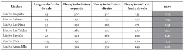 Todos os riachos analisados apresentaram valores de RFAV inferiores a 1 e estão encaixados em vales em formas de v. Os resultados apresentados nesses riachos são similares aos valores obtidos por El Hamdouni et al. (2008) na região da Sierra Nevada, ao sul da Espanha, numa região de limite convergente de placas litosféricas e tectonicamente ativas.