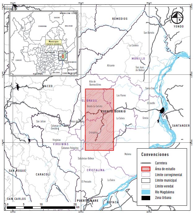 La zona de estudio se ubica a 17 km al occidente de la cabecera urbana del municipio de Puerto Berrío y del río Magdalena, en la zona de vida Bosque húmedo Tropical (Bh-T), cuyo uso dominante del suelo es para ganadería extensiva con doble propósito; adicionalmente, de los bosques se extrae madera.