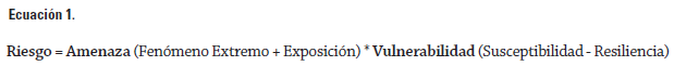 Un fenómeno extremo (brusco o violento) se convierte en amenaza solo cuando hay sistemas (ecosistemas o sistemas humanos) o elementos de sistemas expuestos a la acción negativa de dicho evento; así, la exposición no es vulnerabilidad ni forma parte de esta, sino que es una condición para establecer la amenaza. La vulnerabilidad es la característica a través de la cual es posible juzgar la capacidad del sistema expuesto o su(s) elemento(s) para recibir el impacto, asimilarlo y recuperarse. La vulnerabilidad, a su vez, puede ser de varios tipos (Cardona 2004). El riesgo significa las posibles pérdidas o daños, el posible impacto negativo que generaría el fenómeno extremo -es necesario anotar que, en el tema de cambio climático, en lugar de resiliencia se utiliza capacidad de adaptación o adaptabilidad, dado que este fenómeno no es brusco ni extremo, sino una modificación paulatina a largo plazo-. El cálculo de la vulnerabilidad se realizó con base en lo señalado por el IPCC (2012) y siguiendo la experiencia de Centro Internacional para la Investigación del Fenómeno de El Niño -en adelante, CIIFEN- (2014).