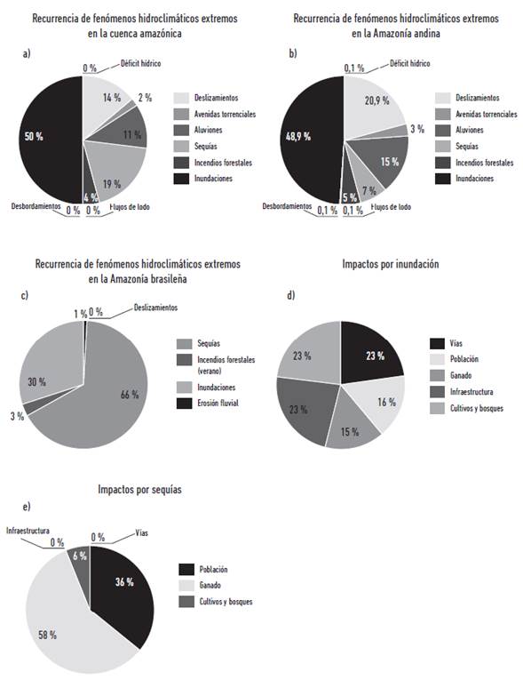 Figura 1: Recurrencia de los fenómenos extremos que generan desastres en la cuenca amazónica (a, b y c) e impactos por inundación (d) y sequías (e).