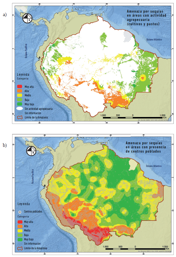 La mayor amenaza por sequía se sitúa en el sur en la zona de las grandes extensiones agropecuarias del sur de Brasil (figura 3a), sectores de la parte alta de la cuenca en los Andes bolivianos; para la población, la mayor amenaza por este fenómeno está en una amplia franja que cubre desde los límites entre Bolivia y Brasil hasta la parte andina de la cuenca en Bolivia y Perú (figura 3b).