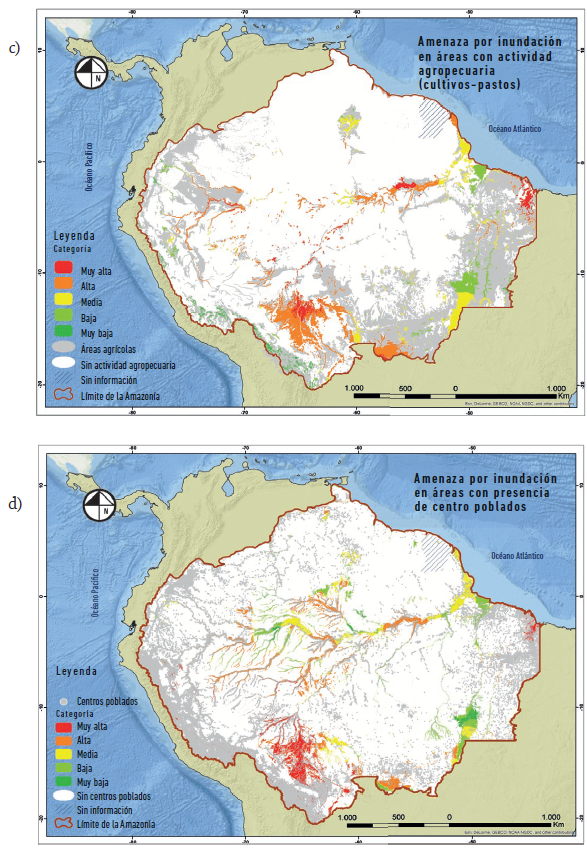 Figura 3: Continuacion. c) amenaza de inundacion para areas con actividad agropecuaria; d) las areas con centros poblados en la cuenca amazonica.