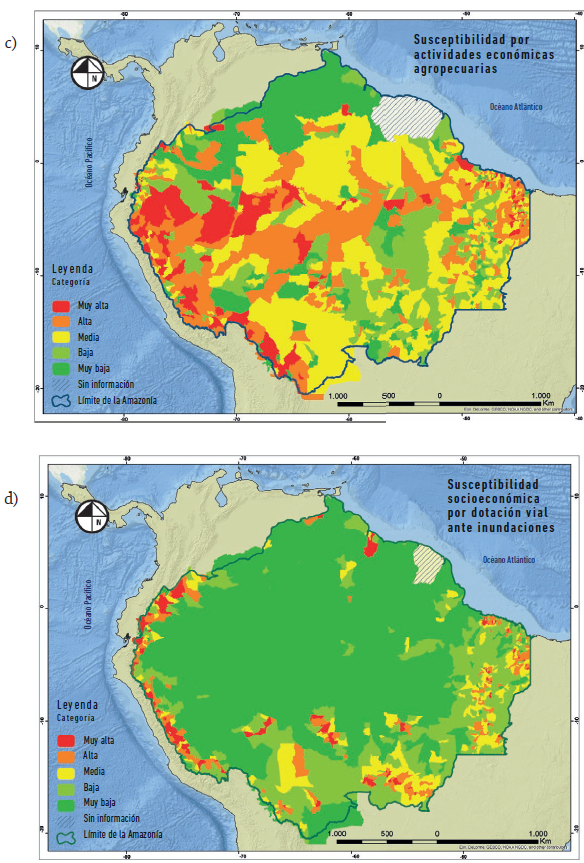 En esta fase de la investigación se obtuvo que, para las inundaciones y las sequías, la susceptibilidad por aptitud del suelo para actividades agrícolas es mayor en el sector oriental y suroriental de la cuenca (figura 4a); la baja aptitud del suelo en estas zonas hace tengan una alta susceptibilidad frente a los fenómenos hidroclimáticos extremos analizados. En los aspectos sociales analizados, la susceptibilidad por edad (figura 4b ) está distribuida de acuerdo con la densidad de los centros poblados, con altas concentraciones en la parte andina, piedemonte y en una franja a lado y lado del río Amazonas; en el arco andino de Bolivia y Perú y en la parte media de los ríos tributarios andinos se registra la mayor susceptibilidad debida a la población económicamente activa dedicada al sector agropecuario (figura 4c). La susceptibilidad del sistema vial ante inundaciones (figura 4d ) mostró los mayores valores sobre una estrecha franja en el arco andino de la cuenca y en una banda más ancha a lo largo del borde sur y oriental; esta particular distribución se explica por la mayor densidad de la red de las vías en estos sectores, no necesariamente por la zonificación de las inundaciones.