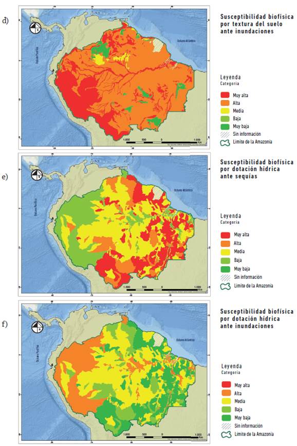 El análisis del estado de los sistemas expuestos a los embates de la sequía señaló que la vulnerabilidad es mayor en la parte alta andina (Amazonía boliviana, peruana y ecuatoriana), en el sector de la cuenca del río Juruena (tributario del Tapajós) y en el oriente, sobre un amplio sector entre las cuencas de Xingú y Tocantins, así como en el norte, en un pequeño sector correspondiente a la parte alta del río Branco. Para las inundaciones, se encontró que la mayor vulnerabilidad se ubica en un amplio sector del suroriente, en localizaciones a lo largo del río Amazonas y en el piedemonte de los Andes; toda la zona plana contigua al río Amazonas o de sus afluentes presenta vulnerabilidad alta o muy alta.
