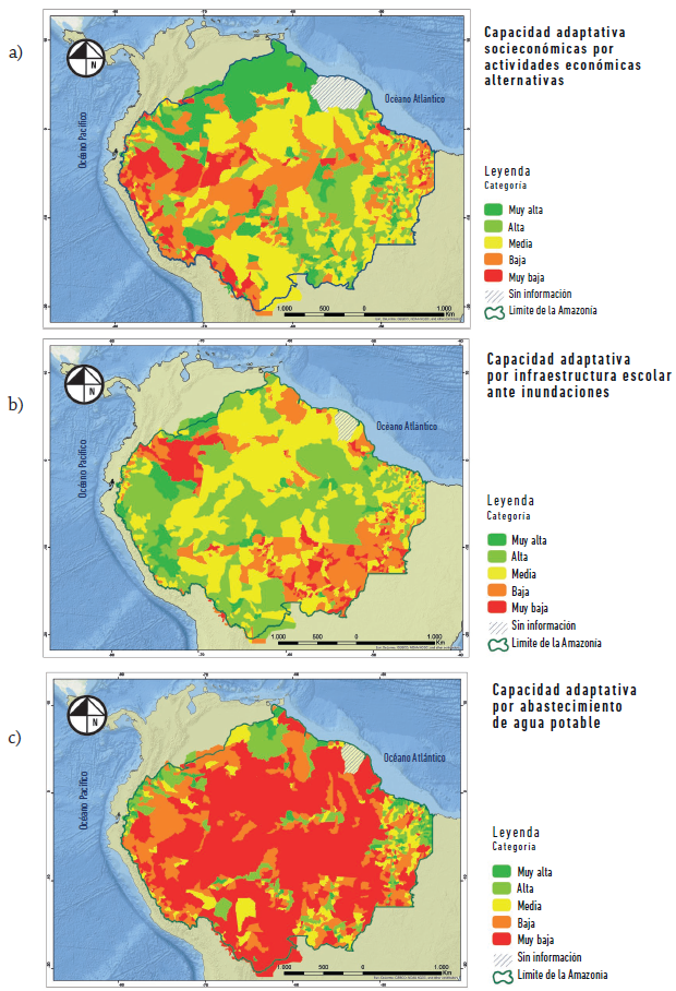 Al analizar la capacidad adaptativa ante las sequías e inundaciones por disponer de actividades alternas a las agropecuarias (figura 6a), se obtuvo que la menor capacidad adaptiva está en el sector andino de la Amazonía y en la franja a lo largo del río, justamente sobre las zonas en donde se señaló la mayor susceptibilidad. Otro indicador analizado fue la capacidad adaptativa por infraestructura educativa (figura 6b), que resultó ser baja en amplios sectores; sin embargo, en las zonas con mayor densidad de población, en donde la exposición de esta es mayor, este indicador presenta valores de moderada a alta, excepto en el sector sur y oriental, en donde es baja. La distribución de la capacidad adaptativa por abastecimiento de agua en la cuenca (figura 6c) es buena, dado que, como en gran parte de la región, el suministro de agua es relativamente bueno; solo en el sur de la cuenca, en los llanos de Bolivia, se presenta una muy baja capacidad de adaptación en este aspecto.
