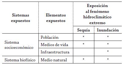 Si se tiene en cuanta el análisis de las estadísticas de los desastres por fenómenos hidroclimáticos extremos expuesto en la figura 1, así como la distribución espacial de la población y sus actividades, se pueden inferir los principales sistemas o elementos del medio biofísico y socioeconómico que están expuestos al impacto de los fenómenos, lo cual se sintetiza en la tabla 1.