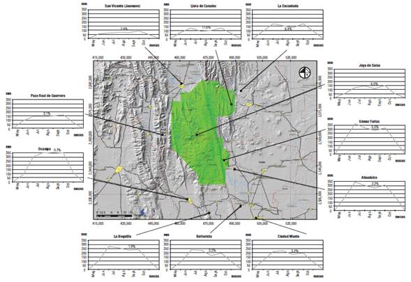 Datos: elaborado a partir de los registros mensuales pluviométricos continuos de CONAGUA 1922-2012.
