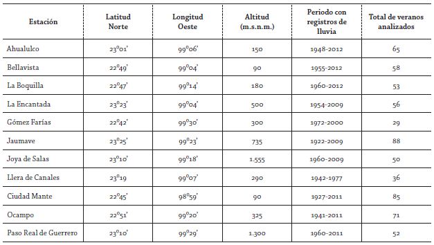 Tabla 1: Ubicación geográfica de las estaciones climatológicas en el entorno y la Reserva de la Biosfera El Cielo, Tamaulipas, altitud, periodo de registro pluviométrico y total de veranos analizados entre 1922-2012