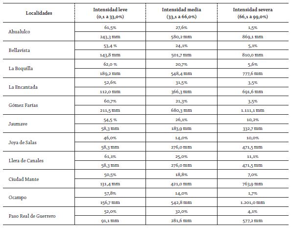 Tabla 4: Límites porcentuales de los intervalos de intensidad (débil, media y severa) en el entorno y la Reserva de la Biosfera El Cielo, Tamaulipas, México entre 1922-2012.