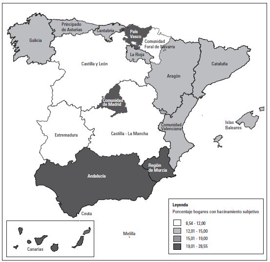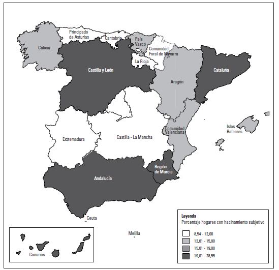 Según el criterio de hacinamiento objetivo utilizado en esta investigación, en el periodo 2004-2007 esta condición se presentaba en el 6,9% del total de los hogares españoles. En números absolutos, el hacimiento afectaba a cerca de 1.050.000 hogares, concentrados de manera desigual en el territorio. Es en las Islas Canarias donde hay mayor porcentaje de hogares hacinados, así como sucede en los territorios de Ceuta y Melilla (entre 10% y 20%). Un segundo grupo de comunidades autónomas con altos porcentajes de hacinamiento lo conforman Andalucía, la Región de Murcia, la Comunidad de Madrid y el País Vasco, donde hay entre un 7% y un 10% de hogares hacinados.