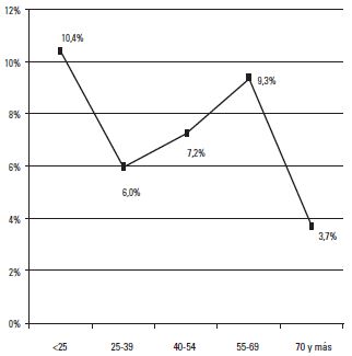 Figura 5: Porcentaje de hogares con percepción de insuficiencia del espacio por grupo de edad de la persona de referencia (España 2007).