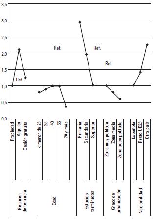 Figura 6: Regresión logística de la percepción de falta de espacio según las características sociodemográficas de la persona de referencia del hogar (España 2007).