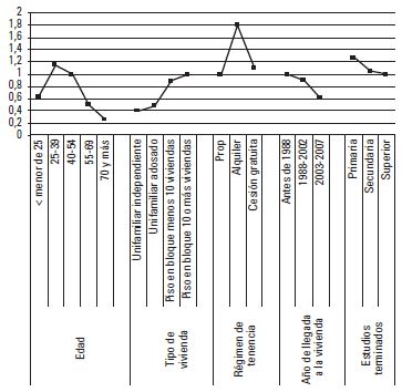 Por último, la no inclusión de la “nacionalidad” de la persona de referencia del hogar en el modelo del hacinamiento subjetivo indica la pertenencia al grupo de los “conformistas”, sobre todo los extracomunitarios. Lo mismo podría argumentarse para los hogares que se instalaron más recientemente en sus viviendas.
