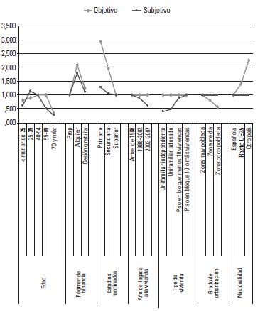 Pero las diferencias entre el hacinamiento objetivo y el subjetivo van más allá de los porcentajes globales y las zonas de concentración. En este sentido, las características del modelo de regresión del hacinamiento subjetivo muestran que las variables más determinantes siguen este orden: edad, tipo de vivienda, año de llegada a la vivienda y los estudios realizados de la persona de referencia. Si estos resultados se comparan con las características del modelo objetivo (tabla 1), por una parte, se evidencia que variables explicativas para el hacinamiento objetivo, como “zona de urbanización” y la “nacionalidad”, no lo son para el subjetivo o percibido; por otra parte, que variables como el “régimen de tenencia” o los estudios de la persona de referencia, aunque explicativas, lo son menos que en el modelo anterior. Estas conclusiones se asocian con los factores que conforman las expectativas de los hogares frente a su condición residencial.