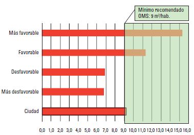 Si bien a escala de la ciudad, el índice global de espacios verdes por habitante (9,2 m2/hab) es óptimo, este presenta notorias heterogeneidades entre las cuatro categorías de calidad de vida, puesto que sus valores revisten un marcado contraste. Así como el área de calidad de vida “más favorable” arroja un valor de 15,3 m2 de área verde por habitante, la de calidad de vida “más desfavorable” no alcanza la mitad de dicho valor (6,8 m2/hab). La brecha entre los extremos se ubica en 8,5 m2/hab. Esta tendencia expresa una relación directa entre los índices de calidad de vida y los de áreas verdes por habitante.