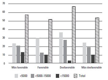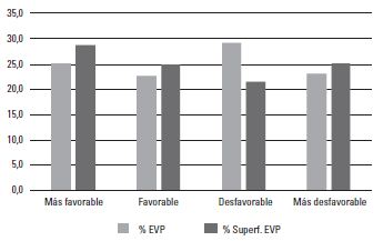 Una distribución similar se observa en el otro extremo de calidad de vida, es decir, con respecto a la categoría más desfavorable. En tanto que en las categorías intermedias se han registrado mayores contrastes: en el área de calidad de vida favorable se da la preeminencia de los espacios de hasta 5.000 m2 (se registraron 29 espacios), mientras que en el área desfavorable tienden a predominar prácticamente de modo similar los espacios verdes de hasta 5.000 m2 y los que tienen entre 5.000 m2 y 15.000 m2, en los que se contabilizan respectivamente 36 y 27 EVP.