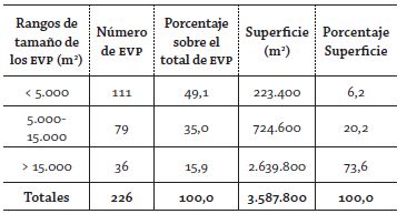 Un segundo aspecto destacable tiene que ver con la magnitud o tamaño de los EVP, dado que ello alude al potencial de estos espacios (grado de equipamiento, valor paisajístico o área de influencia). La tabla 2 desagrega los EVP de acuerdo con “rangos de tamaño”.