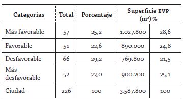 Si se tienen en cuenta el número y la distribución de los EVP de la ciudad según las cuatro áreas de calidad de vida, se observa de acuerdo a los datos consignados en la tabla 4, cierta paridad en el reparto de las cuatro áreas de calidad de vida. Respecto de la cantidad de espacios, aparece en primer lugar la categoría “desfavorable” de calidad de vida con 66 espacios verdes y el 29,2% del total. No obstante, muy cerca se ubica la categoría “más favorable” con 57 áreas y más de un cuarto de los espacios verdes.