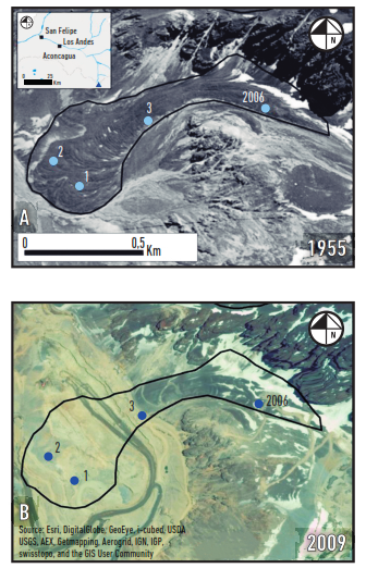 Figura 1: Glaciar rocoso Cerro Negro (33o8’35” S - 70o14’56” W) en los años 1955 y 2009.