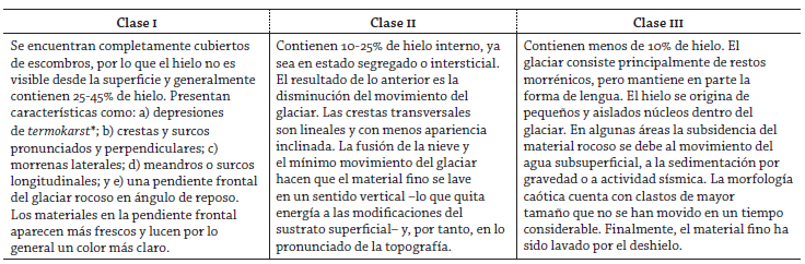 Janke, Bellisario y Ferrando (2015) generaron una clasificación de glaciares rocosos con base en imágenes satelitales, observación de campo y datos obtenidos por extracción de testigos y perforaciones. La propuesta es una taxonomía que utiliza la morfología superficial como indicador de la proporción de hielo y detrito interno. La clasificación distingue tres clases de glaciares rocosos (tabla 1) y busca mejorar la comprensión y manejo de este tipo de recursos en el plano de la planificación regional, al considerar estos recursos como fuentes hídricas esenciales para las cuencas del semiárido.