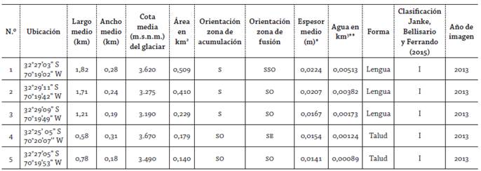 Nota: * Calculado con base en la relación empírica de Espesor Medio, formulada por Chen y Ohmura (1990). La fórmula, de características conservadoras, ha sido validada con sondeos sísmicos en 63 glaciares de montaña de los Alpes y su aplicación ha sido parte de los estudios de Azócar y Brenning (2010), Brenning (2005), Ferrando (2012), Torres, Brenning y García (2013) y Segovia (2015). Fórmula de Espesor Medio: espesor (m) = 28,5 (área en km2)0,357 ** Al área en km2 por el Espesor Medio se le aplicó un factor de 0,5, que es equivalente al porcentaje de hielo estimado para glaciares rocosos (Barsch 1996; Brenning 2005; Segovia 2015). Lo anterior se multiplica por 0,9, que corresponde a la densidad de hielo establecida por Paterson ([1969] 1994). Tal como resume Segovia (2014), la ecuación para estimar el equivalente en agua de los glaciares rocosos es: equivalente en agua (km3) = [(área en km2 x Espesor Medio en km) x 0,5] x 0,9.