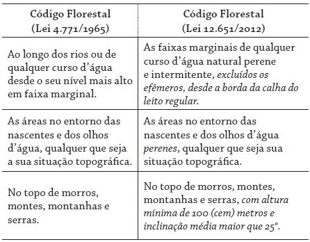 O novo Código Florestal repete do antigo a mesma definição de APP (Presidência da República 2012, art. 3°). Contudo, embora permaneça a maioria dos tipos de APPs em ambas as leis, houve algumas alterações quanto às condicionantes para os limites destas. As alterações estão demonstradas na tabela 1, com destaque em negrito o que mudou, buscando ponderar sobre esse processo de mudanças na legislação ambiental, mesmo antes de serem apresentadas todas as APPs vigentes.