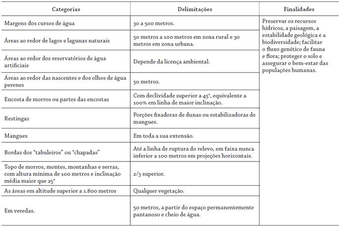 As categorias, limites e finalidades das APPs, de acordo com o Código Florestal vigente, são apresentados na tabela 2, considerando as áreas que deveriam ter sido preservadas.