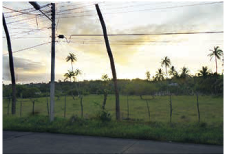 Este concepto de paisaje, entendido como la abstracción hecha por humanos de la tierra o el terreno (que es la entidad física), se vincula además a la propuesta de Ingold (2000) que resalta, por una parte, las características cuantitativa, concreta y medible de la tierra y, por otra, la naturaleza cualitativa, abstracta y totalmente ligada a la visión de cada grupo e incluso de cada sujeto del paisaje. Así mismo, este proceso de interiorización que otorga sentido a la tierra se destaca por cambiar a través del tiempo, en la transmisión de conocimiento entre humanos (recuérdese el carácter acumulativo de la cultura humana), de modo que el sentido de la tierra o el paisaje se trasforma tanto en su transmisión y aprehensión como a través -y esto es particularmente importante para el presente estudio- de la acción humana sobre la tierra. En cierta medida es posible entender dicha acción humana como un ente cuantitativo y homogéneo (en palabras del mismo Ingold 2000) si se lo considera como trabajo, en términos de horas/hombre-mujer. Sin embargo, para el presente estudio es fundamental enfatizar en la dimensión cualitativa y variable de esta acción, llamada en adelante “labor” (es decir task, según Ingold 2000, 195). Estas labores son acciones con el propósito humano de habitar el paisaje y se destacan por no existir ni estar aisladas de otras labores, ni limitadas a un solo ser humano. En otras palabras, las labores humanas sobre el paisaje son siempre sociales y parten de un proceso. Al conjunto de labores que ejerce un grupo humano sobre un paisaje en particular se le denomina “paisaje laboral” o taskscape. De esta forma, el paisaje de Ingold refiere más a la percepción cognitiva propuesta por Korff (2005), mientras que el paisaje laboral apunta más a su definición de percepción utilitaria, al tiempo que la emocional parece estar ligada por igual al paisaje y al paisaje laboral. Un ejemplo de dicha interacción entre paisaje y paisaje laboral se presenta en la figura 1, donde el paisaje de una planicie al pie de The Hill, la cima más alta de San Andrés, posee una connotación de paisaje laboral como tierra de pastoreo de reses, pero en el pasado solía ser un paisaje laboral del cultivo de coco, y, por tanto, la percepción emocional de este terreno, en particular, para quienes vivieron el auge del coco, sigue siendo el de una campo de cocos.