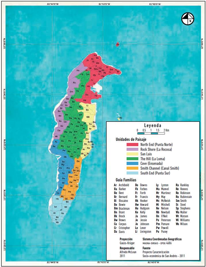 Antiguos sectores de la isla, con sus respectivos nombres, delimitaciones y linderos, así mismo ligados a familias específicas en áreas concretas de la isla, fueron hallados en el marco de la presente investigación. En efecto, con ayuda del cartógrafo Alfredo McLean fue posible hallar, con un notable grado de detalle, la distribución de la propiedad de la isla alrededor de 1950. En la figura 4 se presenta un mapa esquemático de dicha distribución y de las unidades de paisaje (Mazzoni 2014) más sobresalientes identificadas en las entrevistas. Si bien aquí se presentan siete potenciales unidades de paisaje basadas en sus nombres tradicionales, es importante notar que todas ellas están a menudo conformadas por unidades más pequeñas que difícilmente podrían ser presentadas en un solo mapa. Por ejemplo, el área de Smith Channel (figura 4) abarca los sectores más puntuales de Tom Hooker, Rocky Point y Pepper Hill, y The Hill incluye los diferentes promontorios en la colina, como Harmony Hall Hill, Barack o Flowers Hill. Dado que estos nombres tradicionales tienen efecto tan notorio en la construcción y disrupción en la percepción del paisaje, estas unidades ameritan ser elaboradas con mayor profundidad en el marco de una investigación futura que cuente con la ayuda de sistemas de información geográfica y descripciones del ecosistema.