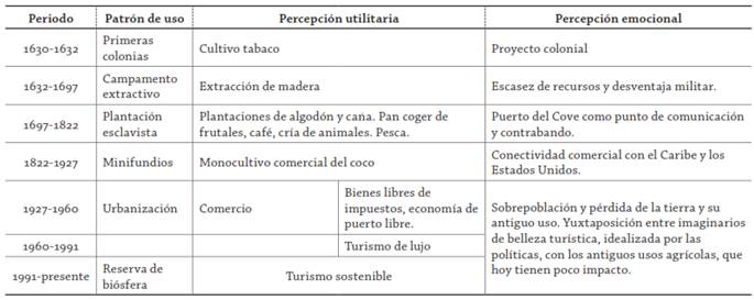 Con el fin de sintetizar los cambios en el uso de la tierra en San Andrés y las posibles implicaciones que este ha tenido en la percepción de la isla a lo largo de la historia, en la tabla 1 se presenta un esbozo de los patrones de uso de la tierra en la isla y sus posibles impactos en las percepciones utilitaria y emocional del paisaje siguiendo las categorías de Korff (2005).