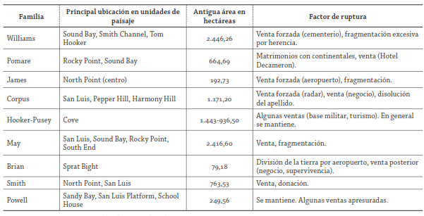 Adicionalmente, a modo de ejemplo, en la tabla 2 se presentan los factores conducentes a la ruptura de la tierra familiar en algunas de las familias con las que fue posible trabajar más a fondo en la duración de esta investigación.