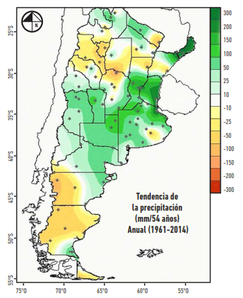 Para los efectos de este trabajo, importa fundamentalmente el río Gualeguaychú como valle de inundación en el que río drena una cuenca de unos 6.981,9 km2 y donde el bioma es central para su conservación, por tratarse de un ecosistema que se retroalimenta. Para Felquer y Moreira (1962) esta área de la cuenca es algo menos baja que la del delta propiamente dicho y, junto al proceso erosivo, los efectos de la creciente son más intensos. Además, el Gualeguaychú desemboca en el Uruguay, y ambos ríos se influencian en diversos escenarios. A los elementos expuestos hay que sumar los actuales procesos generales en los que son clave los cambios en la cantidad, intensidad, frecuencia y tipo de precipitación, de una gran variabilidad natural y alta influencia de los fenómenos. Se han observado aumentos en el promedio anual y en la cantidad e intensidad de las precipitaciones, incluso con cambios tipológicos de focalización extrema que generan crecidas inusuales. En Argentina, el promedio anual presenta un aumento generalizado. Se puede observar en la figura 2 que Gualeguaychú se encuentra en el área de los 300 mm, con tendencia al aumento de la precipitación en 54 años.