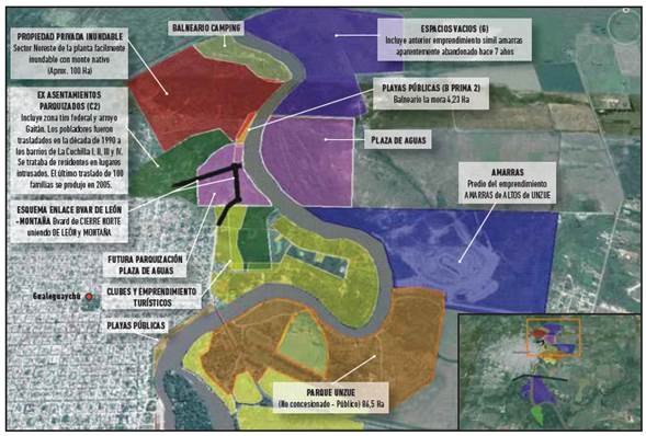 A pesar de esta normativa, la especialización planteada generó cambios espaciales importantes en el río: en ambas costas, sobre la vera del río, se ve la proliferación de cabañas y diversas concesiones (clubes, campings, bares, piscinas, etc.). Están los casos de la Guardería de Lanchas del Tiro Federal Gualeguaychú, el Club de Pescadores, el Balneario Norte y Náutico, que en su mayoría presenta elevaciones clandestinas, lo que evidencia una clara falencia del poder ejecutivo. De todos modos, hay dos casos de barrios cerrados en la costa que han sido suspendidos. Cuando nos alejamos algo de la ciudad, mantiene su importancia la producción agropecuaria de la costa. Por otro lado, se verifica la proliferación de barrios vulnerables sobre zonas inundables, y algunos han sido trasladados, con lo que se generan parquizamientos5, pero aún hay gente viviendo en las partes bajas de los barrios Munilla, Pueblo Nuevo, Ayacucho al sur y Médanos. La densidad es mínima, pero se observa una tendencia al aumento. El mismo caos puede verse cerca de otro futuro parquizamiento, en Plaza de Aguas, cerca del cual hay un basural a cielo abierto. La Municipalidad de Gualeguaychú propone ampliar los citados espacios, incluso parquizando las avenidas y habilitando las reservas mencionadas, junto con los arroyos, como potenciales corredores para parques públicos e interpretación de especies nativas.