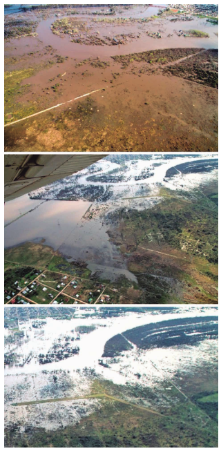 Su condición de humedal puede verse claramente en las fotos sucesivas de la figura 5. En la foto de agosto 2012 (superior), cuando el hidrómetro del puerto marcaba los 3,98 m, el lote de referencia estaba completamente anegado, cumpliendo su rol de valle de inundación. La foto del centro e inferior muestran en el mismo momento el volumen de agua de la península, con sus barrios aledaños.