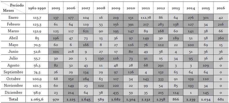 Tabla 1: Comparación mensual: precipitaciones (mm), 2005-2016