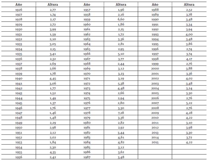 Tabla 3: Puerto Gualeguaychú: alturas máximas anuales (m), 1926-1956